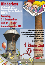 Nach dem Erfolg in den letzten Jahren, wird auch dieses Mal das Fest gemeinsam mit der Stadt Tübingen gestaltet. Zahlreiche Tübinger Vereine und Institutionen, die sich an den Angeboten der "KinderCard" beteiligen, werden das Festprogramm wieder mit eigenen Aktionen bereichern, so dass ein besonders abwechslungsreiches Programm entsteht. Neben Ausschnitten aus kommenden KJT-Produktionen, Gastspielen und Lesungen wird es weitere musikalische und sportliche Vorführungen zu sehen geben. An vielen Aktionsständen kann man außerdem selbst aktiv werden - und es gibt auf dem Hof des LTT auch wieder die Möglichkeit, sich zu schminken, zu basteln oder zu verkleiden.